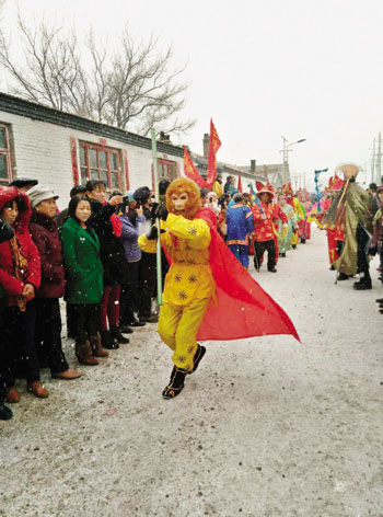 五寨村民觀看八大角秧歌表演“美猴王”惹人愛