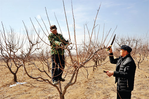 代縣胡峪鄉(xiāng)望臺(tái)村作為全縣優(yōu)質(zhì)干鮮果基地,家家戶戶靠栽植干鮮果樹發(fā)家致富,現(xiàn)已發(fā)展白水杏、仁用杏1900多畝,去年僅干鮮果一項(xiàng)就收入640萬(wàn)元,全村人均純收入6000余元。嘗到甜頭的果農(nóng)們,正月十五一過(guò)就開始著手修剪果樹,期盼今年干鮮果獲得大豐收,將腰包進(jìn)一步鼓起來(lái)。圖為果農(nóng)在修剪果樹。(石俊文 劉睿 攝)