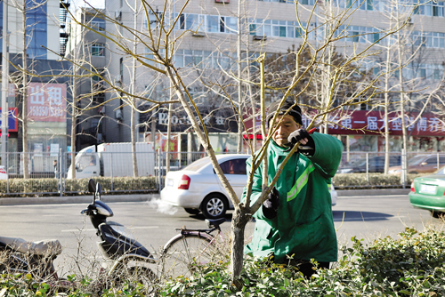 冬去春來,近日,我市園林處組織養(yǎng)護工人,集中修剪城區(qū)內(nèi)凍傷的喬灌木枯枝,確保這些樹木在春天里更好地生長發(fā)芽,美化城市。圖為園林部門的工作人員正在和平街上對樹木進行修剪。(張志遠 攝)