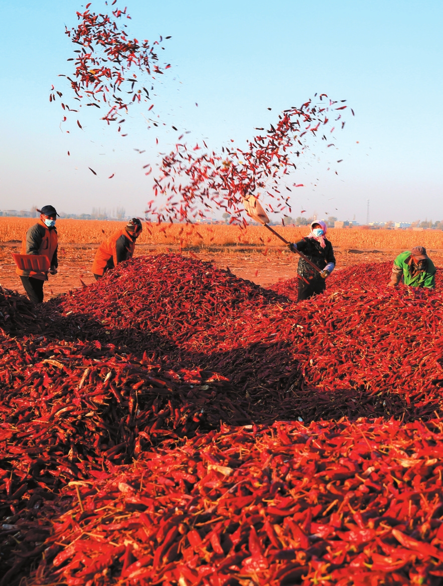 彼時,農(nóng)家院落也成了豐收“展示廳”:屋檐下玉米辮與紅辣椒相映成趣,晾曬場上谷物、干果鋪展成金色“地毯”,地窖中土豆、白菜碼放整齊。