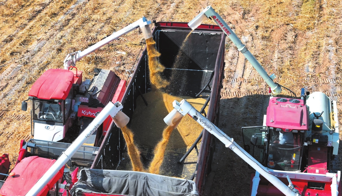 河曲縣劉家塔鎮(zhèn)千畝谷子基地搭載北斗導(dǎo)航系統(tǒng)收割機(jī)正在作業(yè)。何帥攝
