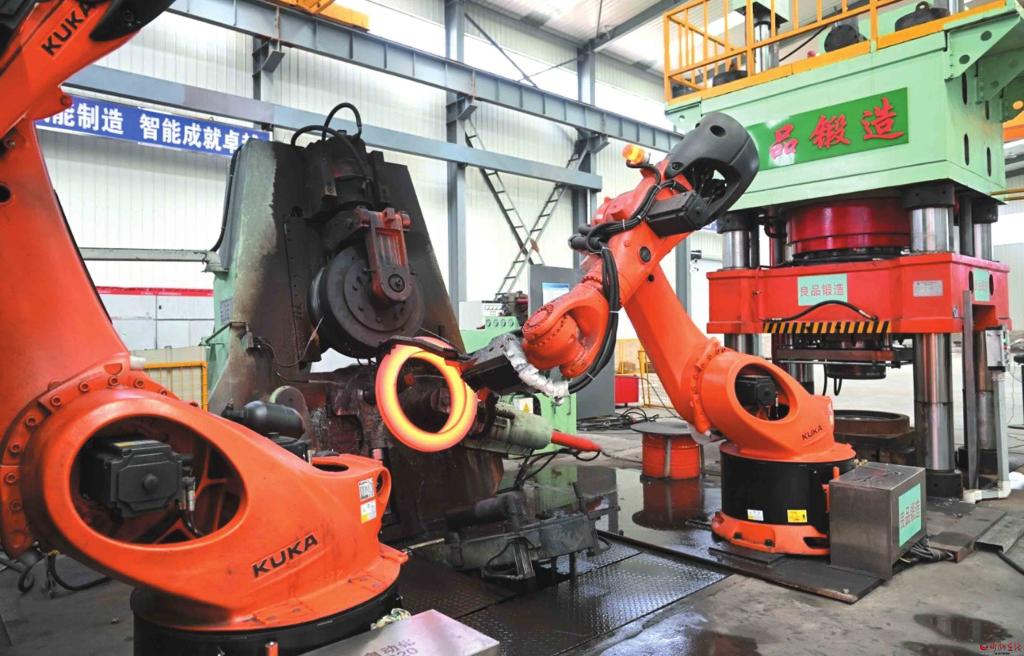 定襄縣秉持“綠色發(fā)展,科技創(chuàng)新”理念,大力推進(jìn)法蘭鍛造行業(yè)的裝備升級換代,變精密制造為智能制造。全縣二十多家企業(yè)實現(xiàn)生產(chǎn)智能化改造,生產(chǎn)效率提高了百分之五,成本降低了百分之六,經(jīng)濟(jì)效益大幅提高。圖為山西良品鍛造有限公司法蘭流水線機(jī)器人智能化生產(chǎn)作業(yè)。(張晉蘭攝)