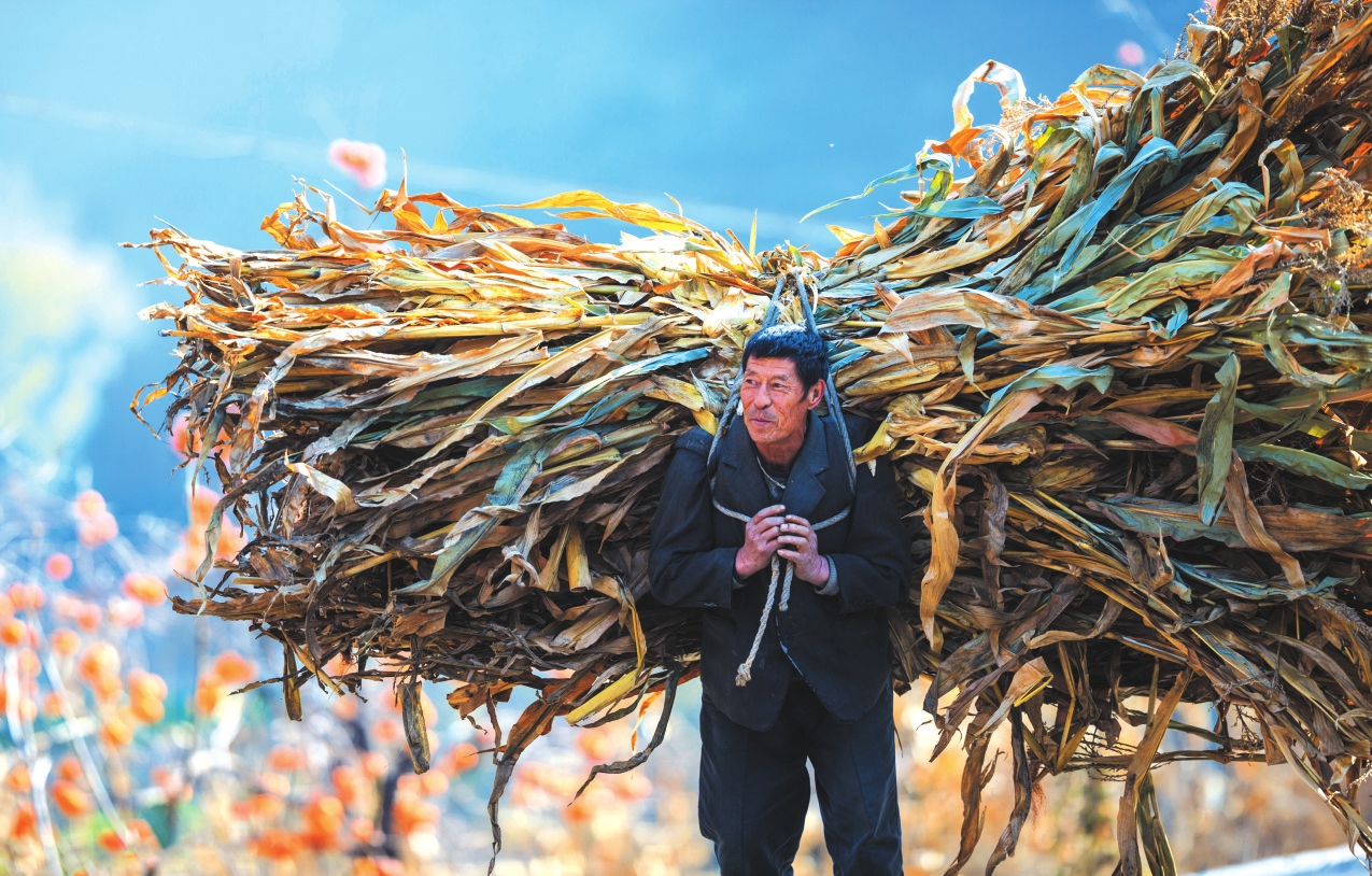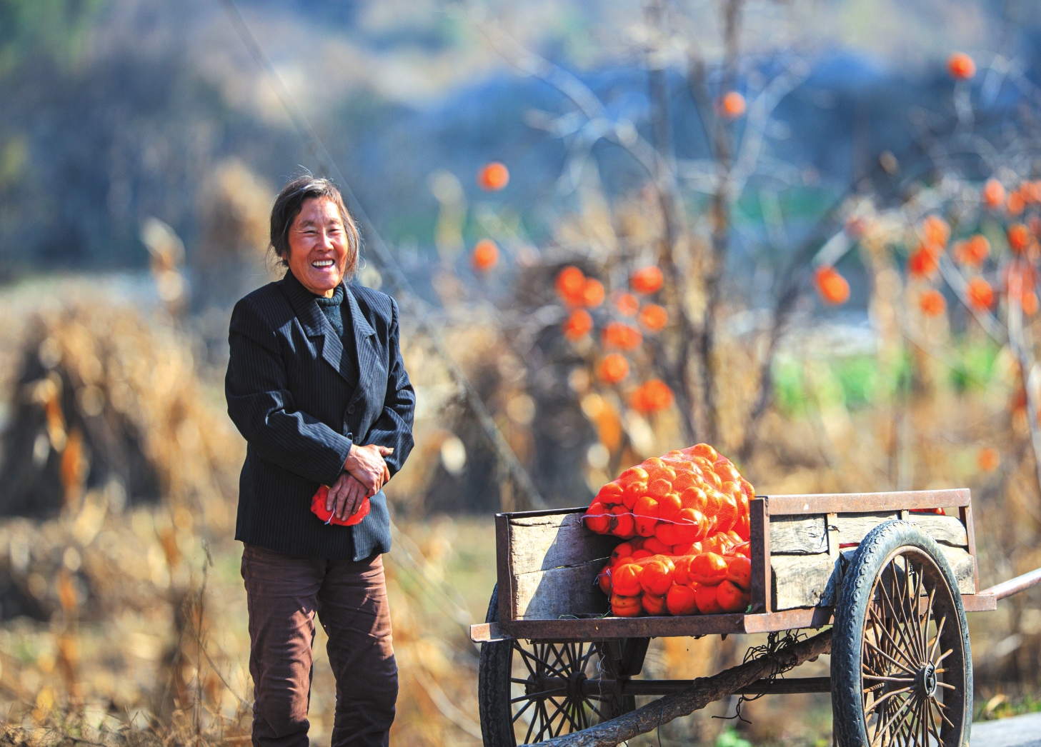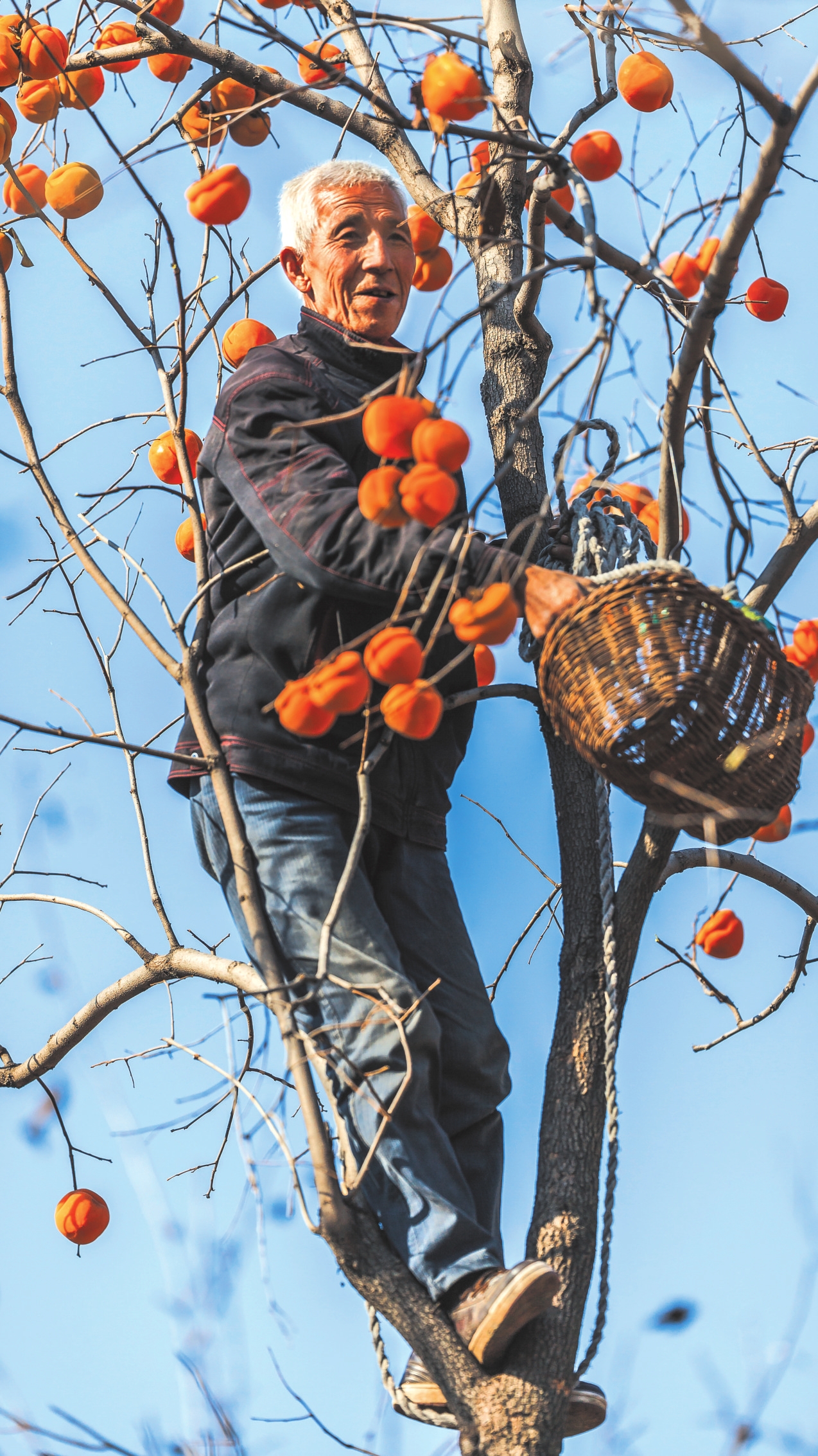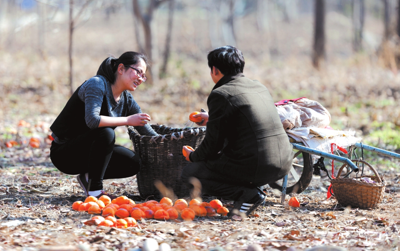 地頭那畔,景象便不同了。一對(duì)年輕的夫婦,正手腳利落地采摘、分揀柿子。竹籃里,橙紅的果實(shí)漸漸堆成小山。他們時(shí)而低語(yǔ),聲音輕得像風(fēng)拂過(guò)枝梢,說(shuō)的或許是今年柿子的成色,盤算著能賣個(gè)好價(jià)錢;或許是在憧憬,等這筆錢到手,該給娃添置些什么。他們額上有細(xì)密的汗珠,眉宇間有勞作后的倦色,但那份倦色底下,卻藏不住一股子蓬勃向上的勁兒,一種屬于明天的、清亮亮的盼頭。