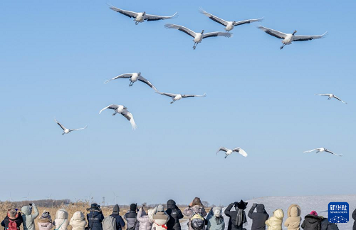 時值深冬,位于黑龍江省齊齊哈爾市的黑龍江扎龍國家級自然保護區(qū)銀裝素裹,冰雪中起舞飛翔的丹頂鶴吸引游客前來參觀、拍照。