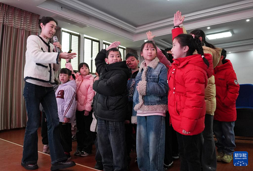 2月8日,在河南省沁陽市朱載堉音樂廳,小朋友們?cè)凇吧賰捍和怼鄙媳硌菁w詩朗誦《非遺里的中國(guó)》。(新華社發(fā) 楊帆 攝)