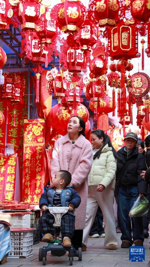 2月11日,家長帶著孩子在貴州省都勻市年畫市場選購春節(jié)飾品。(新華社發(fā) 肖偉 攝)