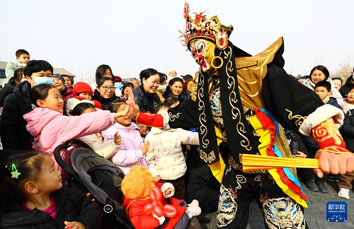 2月10日,在河南省周口市川匯區(qū)關(guān)帝廟廣場,進行表演的民間藝人與觀眾互動。(新華社發(fā) 高建中 攝)
