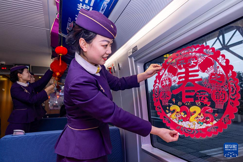 2月11日,南京客運段G2584次列車乘務(wù)員在餐車內(nèi)貼窗花。(新華社發(fā) 湯德宏 攝)