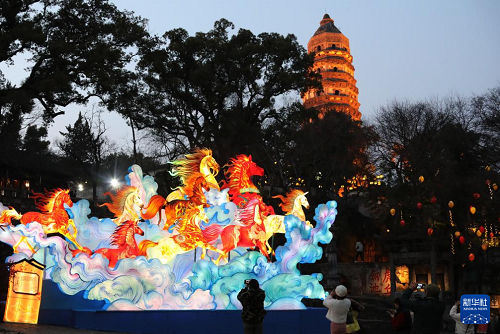 2月10日,人們在河南省三門峽市陜州區(qū)地坑院景區(qū)欣賞花燈(無人機照片)。(新華社發(fā) 孫猛 攝)