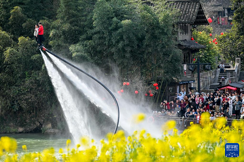2月23日,游客在貴州省遵義市烏江寨景區(qū)體驗“水上飛人”項目。(新華社發(fā) 袁福洪 攝)