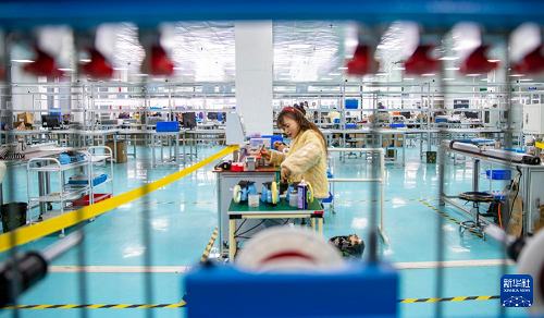 2月24日,在位于河南省商丘市睢縣高新技術(shù)產(chǎn)業(yè)開發(fā)區(qū)的商丘中軒電子科技有限公司電子線束生產(chǎn)車間內(nèi),工人趕制電子排線外貿(mào)訂單。(新華社發(fā) 徐澤源 攝)