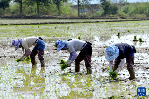 2月23日,云南省西雙版納州勐??h勐遮鎮(zhèn)曼拉村的村民在稻田里插秧。(新華社發(fā) 佐連江 攝)