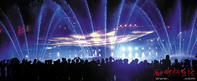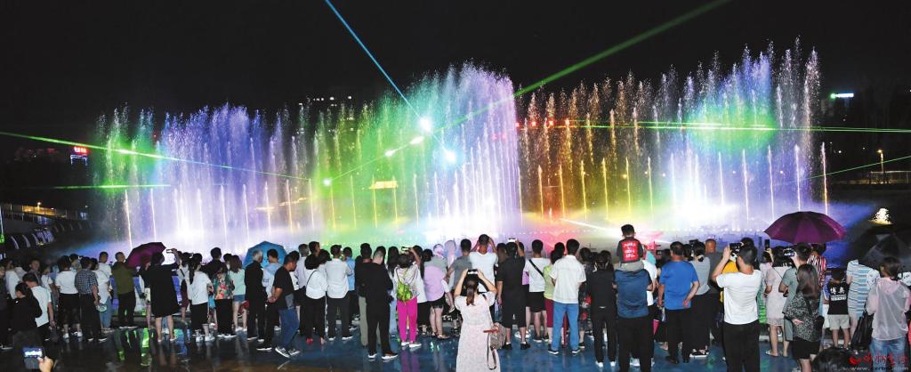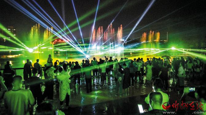 公園在注重園林、景觀建設(shè)的同時,突出主題文化內(nèi)涵的展現(xiàn),湖水噴泉、觀賞果園、主題植物園、階梯花臺等特色園林具有觀賞性,園內(nèi)還配套建有遺山文化館、張拉膜廣場、健舞劇場、休閑茶吧、咖啡館等群眾休閑活動場所,是又一惠及民生的心靈家園。圖為8月1日晚,市民在遺山公園噴泉廣場觀賞絢麗多彩的噴泉燈光秀。劉紀森 智芝龍 白曉明 胡 煒 攝
