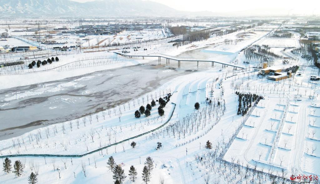 雪后的牧馬河生態(tài)公園,在白雪的覆蓋下,若隱若現(xiàn),美不勝收。(