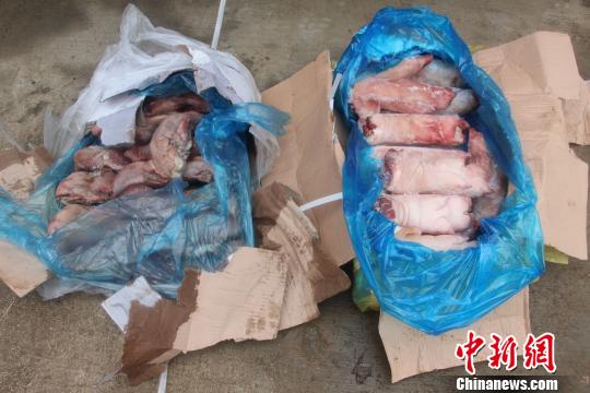 1月25日8時許,支隊瀾滄邊境檢查站執(zhí)勤官兵查獲3輛可疑貨車,當(dāng)場從車廂內(nèi)查獲用麻布袋遮蓋的冰凍雞腳、豬腳等走私凍品105噸。1月27日19時30分,普洱邊防支隊支隊黃莊查緝點在323國道某段開展公開查緝,查獲2輛由景洪駛往昆明的貨車,發(fā)現(xiàn)車內(nèi)拉載的冰凍鴨掌等凍品外包裝均是英文標(biāo)識,且沒有任何檢驗檢疫及運輸銷售等合法手續(xù)憑證,經(jīng)稱重共計9噸。如果沒有被邊防官兵查獲,那這些從境外走私入境的劣質(zhì)過期冰凍肉質(zhì)品,將在春節(jié)期間流入至少2萬戶家庭的餐桌。