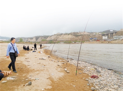 當(dāng)日下午3時(shí)許,蘭州晨報(bào)記者在雁白大橋西側(cè)的黃河岸邊看到12把魚竿一字排開,3名釣魚者坐在旁邊沙灘上正在等待魚兒上鉤,還有兩名中年男子正在周圍撒網(wǎng)。在相隔十多米處,記者發(fā)現(xiàn)還有兩名男子分別撐著魚竿釣魚,有一名捕魚者在撒網(wǎng)。“這是雙面粘漁網(wǎng),河內(nèi)稍大一些的魚兒只要撞進(jìn)網(wǎng)里就擺脫不了。”一名捕魚男子得意地說。