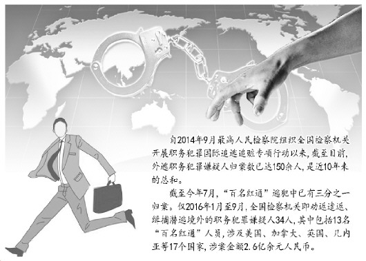 據(jù)了解,截至今年7月,“百名紅通”逃犯中已有三分之一歸案。僅2016年1月至9月,全國檢察機(jī)關(guān)即勸返遣返、緝捕潛逃境外的職務(wù)犯罪嫌疑人34人,其中包括裴健強(qiáng)、陳祎娟、付耀波、周世勤等13名“百名紅通”人員,涉及美國、加拿大、英國、幾內(nèi)亞等17個(gè)國家,涉案金額2.6億余元人民幣。