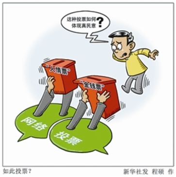 從紅遍大江南北的超女、快男開始,各種評選活動日益增多,最萌寶貝、最美司機、最美景點等等,你方唱罷我登場,好不熱鬧。投票手段也不斷演進,手機短信、網(wǎng)絡(luò)海選、朋友圈投票等,花樣翻新、不一而足。投票方式雖與時俱進,衡量投票結(jié)果的標(biāo)準(zhǔn)卻未變,票數(shù)多少固化為讓各方“信服”的指標(biāo),如何獲得票數(shù)則一概不論。