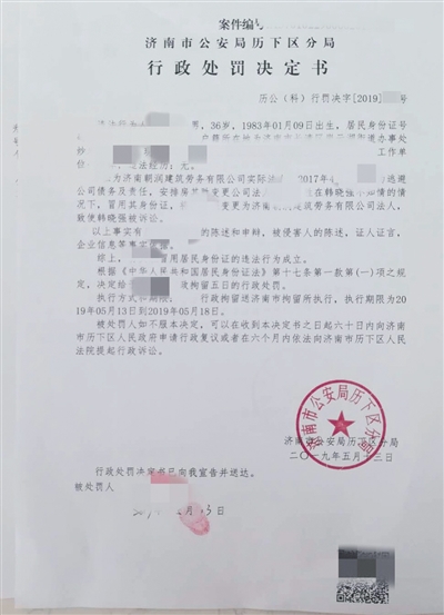 濟南市公安局歷下區(qū)分局出具的行政處罰決定書顯示,冒用韓曉強身份證者被行政拘留5日。