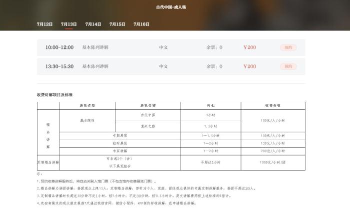 古代中國(guó)展收費(fèi)講解項(xiàng)目及標(biāo)準(zhǔn) 截圖自國(guó)家博物館官網(wǎng)