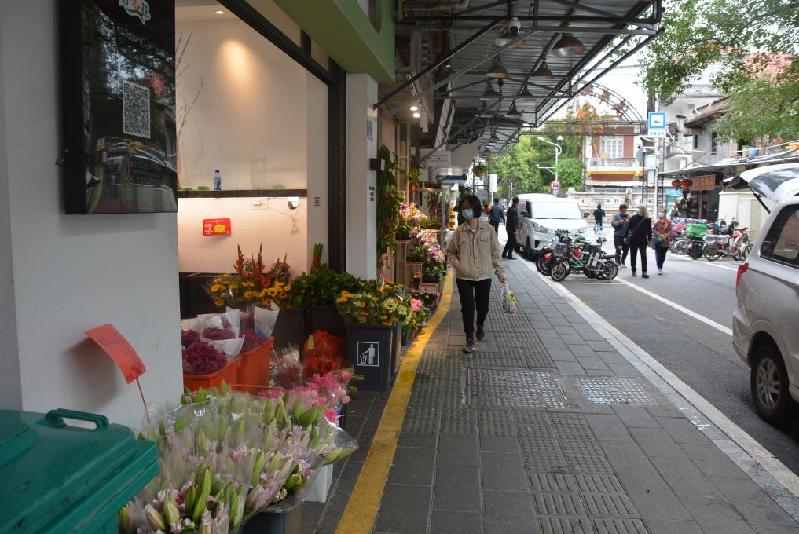 圖為2月8日記者拍攝的廈門溪岸路花鳥市場(chǎng),黃色實(shí)線內(nèi)側(cè)為允許商家“適當(dāng)經(jīng)營(yíng)外擺”的區(qū)域。新華社記者顏之宏 攝