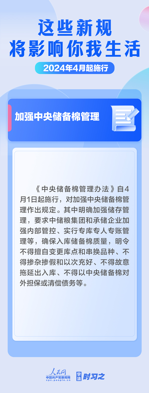 加強(qiáng)中央儲(chǔ)備棉管理;明確托育機(jī)構(gòu)質(zhì)量評(píng)估標(biāo)準(zhǔn);規(guī)范可再生能源電量收購……4月起,這些新規(guī)施行,將影響你我生活。(薄晨棣)