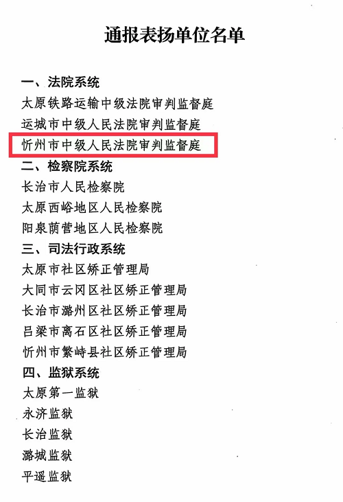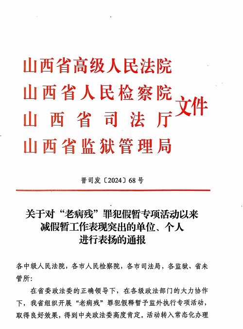 近日,山西省高級人民法院、山西省人民檢察院、山西省司法廳、山西省監(jiān)獄管理局印發(fā)《關(guān)于對“老病殘”罪犯假暫專項(xiàng)活動(dòng)以來減假暫工作表現(xiàn)突出的單位、個(gè)人進(jìn)行表揚(yáng)的通報(bào)》,對減假暫工作表現(xiàn)突出的16家單位和25名個(gè)人予以通報(bào)表揚(yáng),忻州中院審判監(jiān)督庭獲評“全省減假暫工作表現(xiàn)突出單位”。