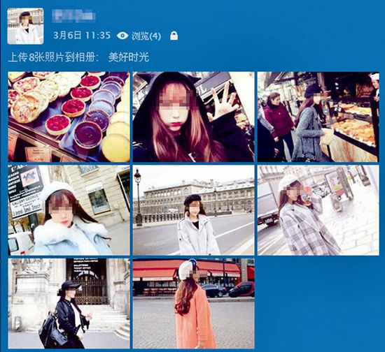 “最好找粉絲在10萬(wàn)以下的網(wǎng)紅?!痹谖⒉┥?,魏強(qiáng)嫻熟地搜到一個(gè)名為“Panny”的模特,點(diǎn)擊其關(guān)注的好友,找到類似幾名網(wǎng)紅,讓記者下載她們的照片,用修圖軟件清除圖片上的水印,再上傳到QQ空間。魏強(qiáng)在QQ上假扮的“白富美”網(wǎng)名叫“Eiffel”,他還煞費(fèi)苦心地更新“Eiffel”的QQ空間。