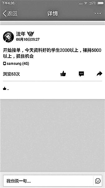 林曉借的錢(qián)越來(lái)越多,30%的利息下,很快500、1000的小額貸款就滿足不了林曉拆東墻補(bǔ)西墻的需求了。“這時(shí)候就看到群里有中介說(shuō),女大學(xué)生可以‘裸持’借款,即使有‘負(fù)債’也沒(méi)關(guān)系,發(fā)送裸照給老板就能借到更多錢(qián)?!?/p>