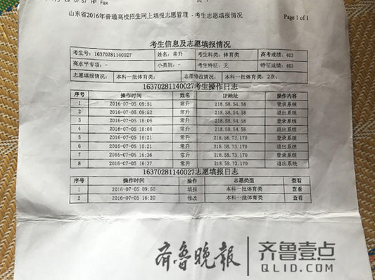 記者注意到,常升在7月5日上午9點(diǎn)51分登陸自己的賬號(hào)填報(bào)好了志愿之后便離開,但是當(dāng)天下午4點(diǎn)多,常升的賬號(hào)再次在同一臺(tái)電腦上登陸,而接下來賬號(hào)又在另外一個(gè)IP地址上連續(xù)登陸兩次,并且用完了兩次修改志愿的機(jī)會(huì)?!拔揖偷顷戇^一次,在遲老師的電腦上?!背If,后面的三次操作他都不知道是誰所為。根據(jù)IP地址提供的線索,無論是誰修改了常升的志愿,都在遲老師的電腦上進(jìn)行過操作,然后又用另一臺(tái)電腦將常升的改志愿次數(shù)用完。常升的準(zhǔn)考證和密碼一直在自己手里保管,唯一有機(jī)會(huì)修改他志愿的就是自己的同窗好友郭某?!拔覀冴P(guān)系很好,我填志愿的時(shí)候他就在旁邊,我也沒防著他?!背If,事發(fā)之后他找過郭某,對(duì)方也私下承認(rèn)了修改了常升志愿的事實(shí),原因則是郭某擔(dān)心常升的分?jǐn)?shù)更高,他怕常升擠掉自己,讓自己沒學(xué)上。隨后,為了挽回常升的損失,雙方家長(zhǎng)進(jìn)行了商談。圖為常升的賬號(hào)修改志愿的記錄。