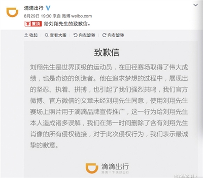 8月29日晚間,滴滴發(fā)出道歉信稱,“官方微博、官方微信的文章未經(jīng)劉翔同意,使用劉翔賽場上照片用于滴滴品牌宣傳推廣,這一行為給劉翔本人造成諸多誤解,在第一時間刪除了含有劉翔先生肖像的所有侵權(quán)鏈接,對于此次侵權(quán)行為,我們表示最誠摯的歉意?!?/p>