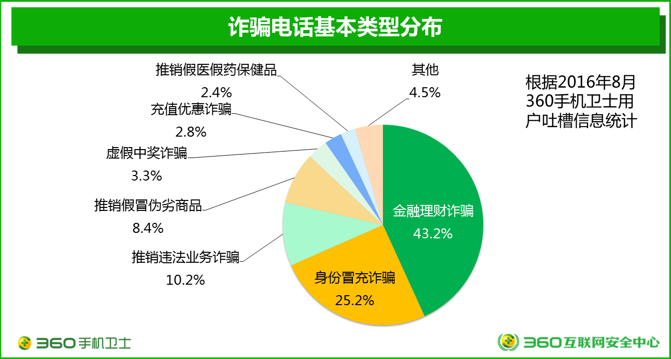 9月7日,360在京發(fā)布了國內(nèi)首份基于大數(shù)據(jù)研究的電信詐騙分析報告——《2016中國電信詐騙形勢分析報告》。報告中顯示,在用戶接到的所有詐騙電話中,虛假的金融理財詐騙最多,占43.2%,此類詐騙在北上廣深等大城市尤其盛行。其次是身份冒充詐騙,占25.2%。各類虛假的業(yè)務(wù)推銷電話也是被用戶大量吐槽的詐騙電話類型。