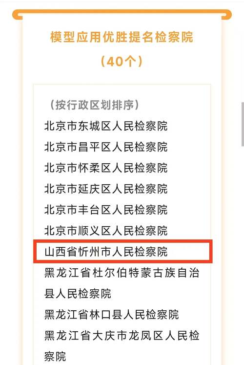 1月8日,最高檢組織的2024年全國(guó)檢察機(jī)關(guān)大數(shù)據(jù)法律監(jiān)督模型推廣活動(dòng)評(píng)選結(jié)果出爐:忻州市人民檢察院在模型應(yīng)用活動(dòng)中進(jìn)入全國(guó)前50名,獲評(píng)全國(guó)“模型應(yīng)用優(yōu)勝提名檢察院”。
