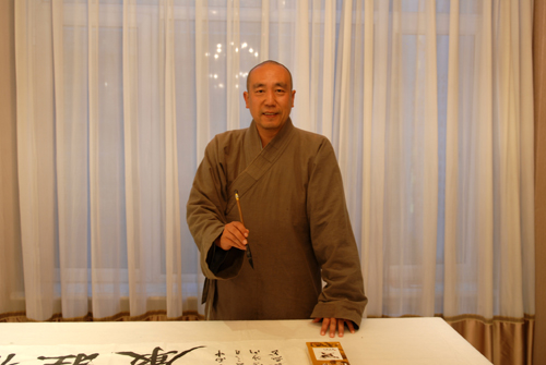 利用閑暇,筆者與行腳僧進行了簡單溝通,了解到法師來自廣東省韶關云門山大覺禪寺,法名圣泰,是云門宗第十五代弟子,酷愛書法,且仰慕五臺山多時,此行特用且行且書的方式了卻多年朝圣心愿。