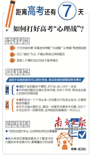 距離高考不足10天,張敏強(qiáng)認(rèn)為,此時(shí)探究學(xué)習(xí)方法、學(xué)習(xí)新知識(shí)已不現(xiàn)實(shí),也難以在短時(shí)間有明顯成效,關(guān)鍵是要做好考前心理調(diào)適以及掌握應(yīng)考技巧。張敏強(qiáng)不建議考生做新的題目,而是要把之前做過(guò)的題目鞏固記憶。他提醒考生,千萬(wàn)勿信所謂的“命題老師押題”等虛假信息,“命題人員的身份是絕密的,即便是命題老師也不會(huì)知道試卷上最終使用了哪一道題目。”
