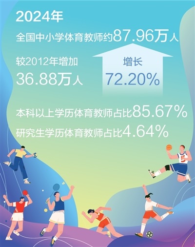 近年來(lái),我國(guó)中小學(xué)體育教師隊(duì)伍不斷壯大。2024年全國(guó)中小學(xué)體育教師約87.96萬(wàn)人,較2012年增加36.88萬(wàn)人,增長(zhǎng)72.20%。特別是近5年,全國(guó)體育教師數(shù)量增速明顯,師資補(bǔ)充力度加大。