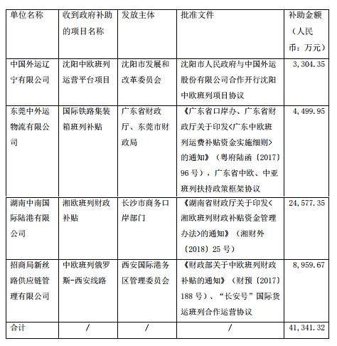 此外,2019年7-9月,中國外運獲得與收益相關(guān)的政府補助合計4.31億元人民幣,主要為與公司日常經(jīng)營緊密相關(guān)的政府補助。 其中,中國外運在2019年7月-9月期間獲得的超過500萬元人民幣的大額政府補貼項目有:沈陽中歐班列運營平臺項目獲得補助金額3304.35萬元、國際鐵路集裝箱班列補貼獲得補助金額4499.95萬元、湘歐班列財政補貼獲得補助金額2.46億元、中歐班列俄羅斯-西安線路獲得補助金額8959.67萬元。