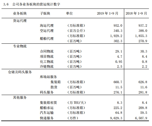 從公司各業(yè)務(wù)板塊運營情況來看,2019年1-9月,中國外運各版塊業(yè)務(wù)量同比增幅較小,其中不乏較上年同比下降的情況。例如,貨運代理中的空運代理、專業(yè)物流中的合同物流、項目物流,倉儲及碼頭服務(wù)中的庫場站服務(wù)散貨、碼頭服務(wù)等具體業(yè)務(wù)的貨運量較2018年同期相比均有所下降。