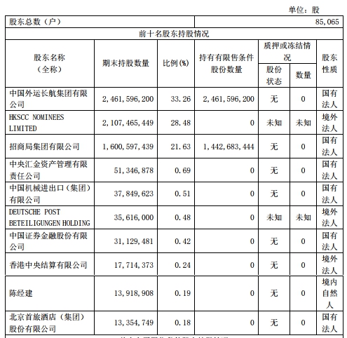 A股上市前,中國外運實控人招商局集團有限公司(簡稱“招商局集團”)于2018年5月28日出具了承諾函,承諾若中國外運于上交所上市之日起5個交易日內(nèi)任一交易日的A股股票交易價低于每股5.24元(除息調(diào)整后),則招商局集團或其關(guān)聯(lián)控制企業(yè)將在該5個交易日內(nèi),增持累計不超過人民幣8億元的資金,直至以下兩項情形中發(fā)生時間的最早者:(1)前述資金用盡;(2)中國外運A股交易價格高于發(fā)行價格。招商局集團或其關(guān)聯(lián)控制企業(yè)在增持完成后的6個月內(nèi)不出售所增持股份。 據(jù)公告,招商局集團于1月18日、21日至24日連續(xù)4日以及1月28日通過上交所證券交易系統(tǒng)以集中競價交易方式累計6次凈增持公司A股股份1.58億股,占公司總股本的2.13%,累計凈增持金額8.00億元人民幣。 10月30日,中國外運發(fā)布第三季度報告。截至2019年9月30日,中國外運前三名股東持股情況為:中國外運長航集團有限公司持有24.62億股,持股比例33.26%;HKSCC NOMINEES LIMITED持有21.07億股,持股比例28.48%;招商局集團持有16.01億股,持股比例21.63%。