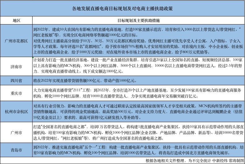 各地發(fā)展直播電商目標(biāo)規(guī)劃及對(duì)電商主播扶助政策