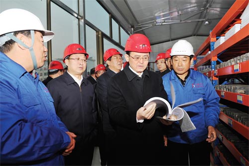 圖為市委書記李俊明在山西天寶集團有限公司調(diào)研質(zhì)量可追溯系統(tǒng)建設情況。(本報記者 劉紀森 攝)