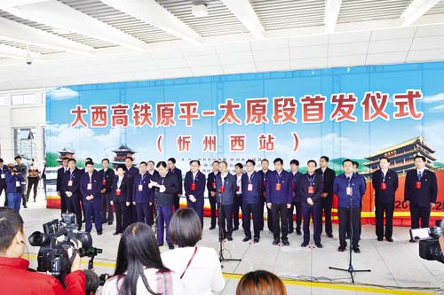 圖為大西高鐵原平至太原段首發(fā)儀式在忻州西站舉行,省人大常委會副主任、市委書記李俊明宣布高鐵開通并發(fā)出發(fā)車指令。本報記者 宮愛文