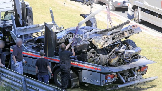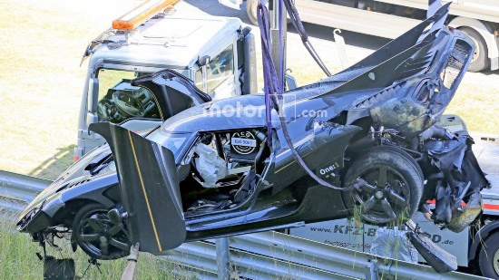 科尼塞克早上發(fā)布消息稱One:1打算在紐北刷新最快圈速紀(jì)錄。知情人表示,刷圈過程中,車輛在高速駛?cè)階denauer Forst彎時發(fā)生失控,車身撞跨賽道左側(cè)的護欄,進而飛入草地,事故令One:1車身損毀嚴(yán)重,前保險杠折斷、擋風(fēng)玻璃破碎,尾部受損。