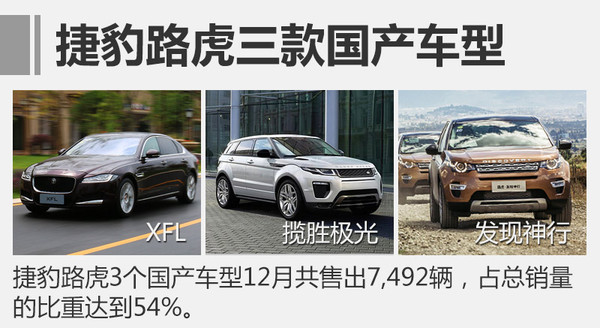 捷豹路虎去年能夠超越自我,實現新的銷量記錄,國產車型成為最重要因素。剛剛結束的2016年12月,捷豹路虎在華共售出13,859輛,與2015年同期(10,227輛)相比大漲36%。其中,捷豹路虎在華合資公司生產的3款國產車型捷豹XFL、路虎極光、發(fā)現神行,12月共售出7,492輛,占總銷量的比重達到54%。