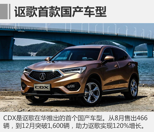 2016年7月,首款國產車型CDX正式上市,新車定位緊湊型SUV,同時也是謳歌產品體系中級別最小SUV車型。CDX上市后逐漸得到市場的認可,從8月份的466輛,增長至11月份的1,110輛,12月更是突破1,600輛。