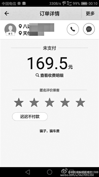 在某網(wǎng)站論壇上,一名順風(fēng)車(chē)司機(jī)爆料說(shuō),晚上下班后接了一單滴滴順風(fēng)車(chē),想著反正順路,上班路上接一單抵個(gè)油費(fèi)也是好的。送到目的地后,自己出于習(xí)慣讓乘客先下車(chē)后付款,沒(méi)想到對(duì)方是用小號(hào)注冊(cè)的滴滴賬戶,晚飯后再打電話已經(jīng)是“空號(hào)”?!斑@顯然是惡意打霸王車(chē)啊?!?/p>