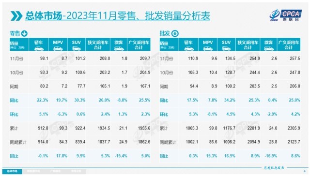 零售方面,據乘聯(lián)會統(tǒng)計,2023年11月,乘用車市場零售達到208.0萬輛,同比增長26.0%,環(huán)比增長2.4%。今年累計零售1934.5萬輛,同比增長5.3%。