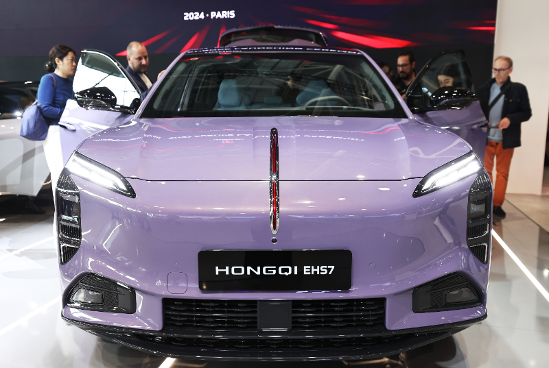 10月14日,人們在法國巴黎凡爾賽門展覽中心舉行的2024巴黎車展媒體開放日上參觀紅旗展臺。新華社記者 高靜 攝