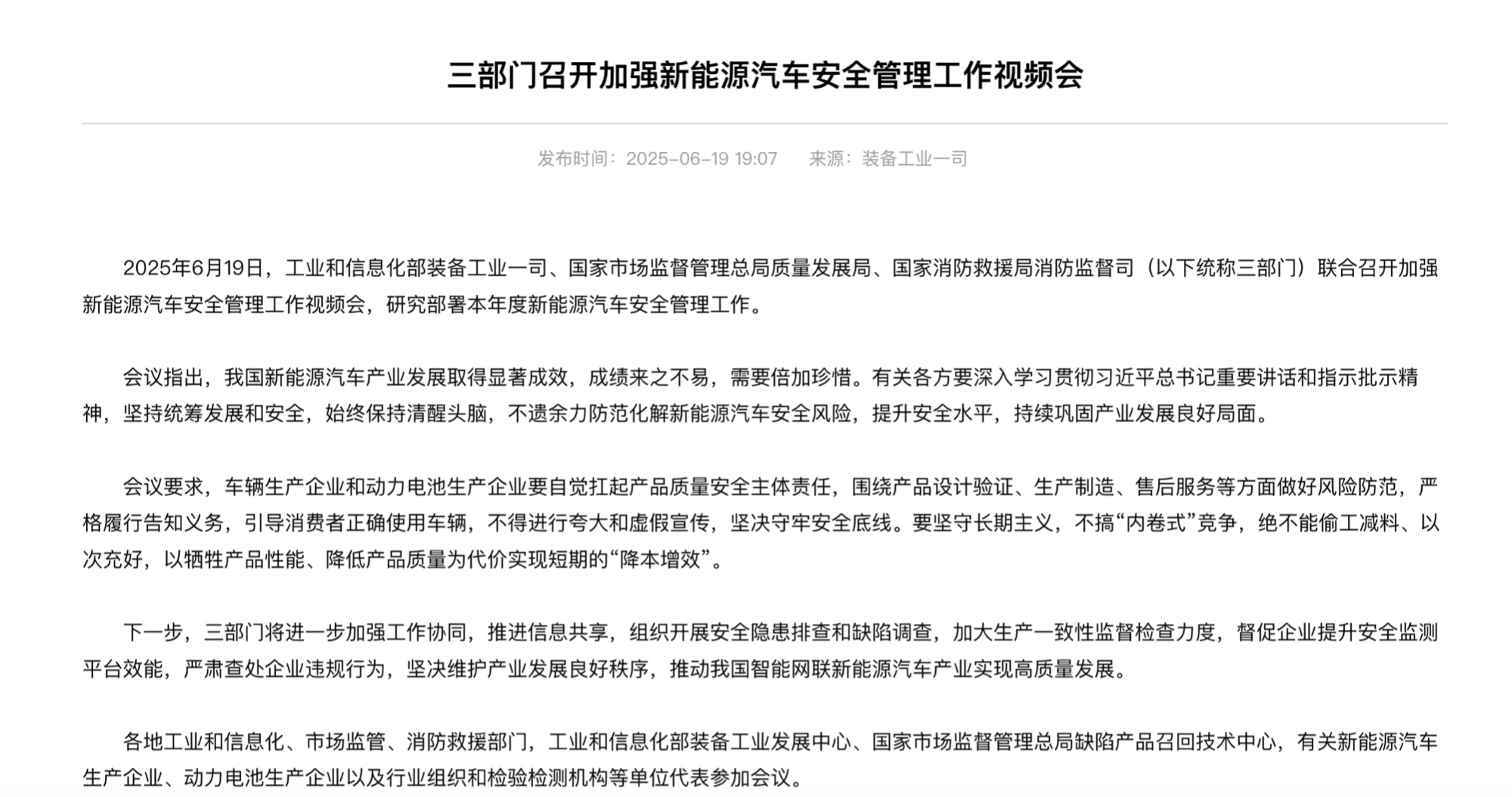 央廣網(wǎng)北京6月20日消息(記者董楠)6月19日,工業(yè)和信息化部裝備工業(yè)一司、國(guó)家市場(chǎng)監(jiān)督管理總局質(zhì)量發(fā)展局、國(guó)家消防救援局消防監(jiān)督司(以下統(tǒng)稱三部門(mén))聯(lián)合召開(kāi)加強(qiáng)新能源汽車安全管理工作視頻會(huì),研究部署本年度新能源汽車安全管理工作。
