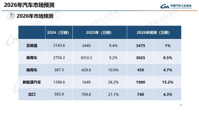 與此同時,中汽協(xié)對2026年汽車市場進行了預測。2026年,預計國產(chǎn)汽車總銷量將達到3475萬輛,微增1%。其中,乘用車預計為3025萬輛,微增0.5%;商用車預計為450萬輛,小幅增長4.7%;新能源汽車預計為1900萬輛,增長15.2%;汽車出口量預計為740萬輛,小幅增長4.3%。